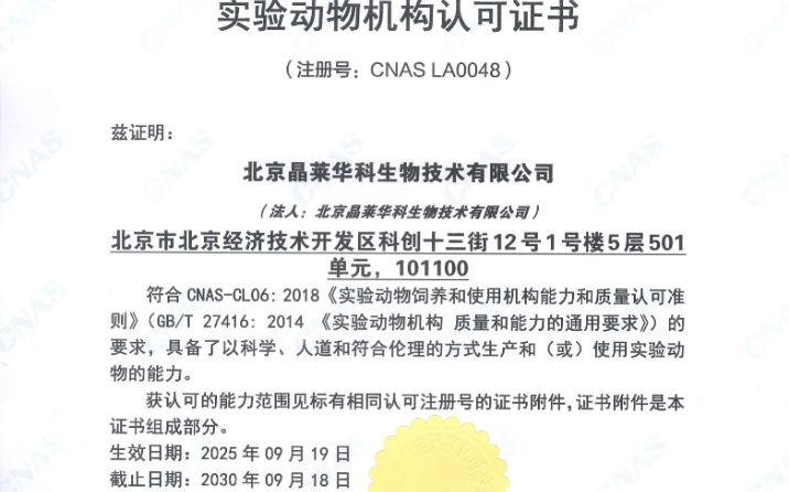 喜报!北京晶莱华科生物技术有限公司荣获CNAS实验动物机构认可证书! 北京晶莱华科生物技术有限公司(以下简称“晶莱生物”)正式获得由中国合格评定国家认可委员会(CNAS)颁发的实验动物机构认可证书(证书编号:CNAS LA 0048)。这一权威认可标志着晶莱生物在实验动物质量控制、管理体系和技术能力等方面已达到国内领先、国际认可的标准。 查看详情>> 科研人速看!2024影响因子重磅发布,你的期刊涨了没? 2024年度JCR发布! 神刊CA-A CANCER JOURNAL FOR CLINICIANS的影响因子降低了一半,它依然以232.4的高IF位列榜首。 查看详情>> 最新影响因子发布!聚焦7-15分期刊及肿瘤领域重点期刊! 最新影响因子发布 查看详情>> 省政府驻京办副主任叶劲松带队走访调研邵阳商会副会长单位晶莱生物 8月28日下午,省政府驻京办党组成员、副主任叶劲松带队,信息联络处处长、一级调研员戴虹,信息联络处副处长易伟,北京世纪华天大酒店总经理骆宗禾,中国邮政储蓄银行北京分行普惠金融部经理刘瑶等一行,在邵阳市人民政府驻北京办事处党组书记、主任戴先平及北京湖南企业商会秘书长李轩、常务副秘书长刘利亚等陪同下走访调研副会长单位北京晶莱华科生物科技有限公司,受到北京邵阳企业商会副会长、晶莱公司董事长刘建军等负责人的热情接待,宾主双方并举行座谈交流。 查看详情>> 动物超声成像服务 超声成像的优点在于其非侵入性、实时性、高分辨率和多参数分析能力。它广泛应用于医学和科研领域,可以用于观察器官、组织和血流的结构和功能,对疾病的诊断和治疗提供重要参考。 心血管研究是超声成像系统应用的主要领域,同时,在肿瘤疾病研究、腹部脏器研究以及消化系统研究等领域中也具有广泛的应用。 查看详情>> 晶莱生物&捷方凯瑞2024年第一期类器官培养技术培训班圆满举行! 6月6日-6月7日,2024北京第一期类器官培训班圆满举行。 查看详情>>