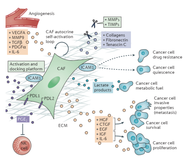 CAFs分泌胶原蛋白、纤维连接蛋白和基质金属蛋白酶(MMPs),重塑ECM的物理特性: