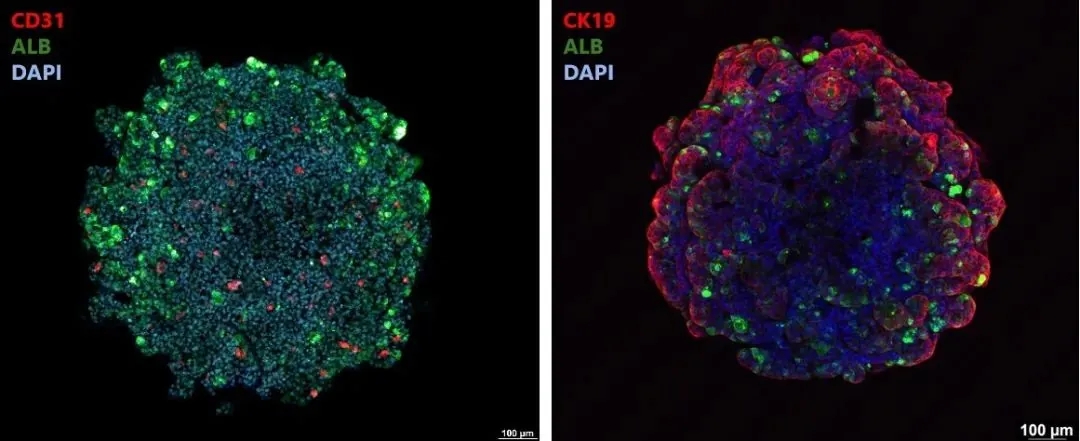 免疫荧光染色显示,类器官中包含多种关键肝脏细胞类型:表达血小板内皮细胞黏附分子1(CD31)的血管内皮细胞在肝脏类器官表面和内部均有分布,表达白蛋白(ALB)的肝实质细胞和表达细胞角蛋白19(CK19)的胆管细胞也清晰可见,且胆管细胞主要分布于肝脏类器官的外周区域。这一特征模拟了天然肝脏组织的极性结构——在肝小叶中,肝细胞位于中央区域,而胆管细胞则分布在外周的门管区附近。