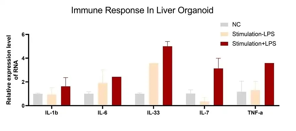 在高脂高糖刺激的基础上,加入脂多糖(LPS)处理肝脏类器官。结果表明,LPS显著诱导了先天免疫相关因子(如IL家族蛋白)和肿瘤坏死因子α(TNF-α)的上调,说明肝脏类器官能够有效地模拟肝脏在病理刺激下的炎症反应及相关通路的激活。