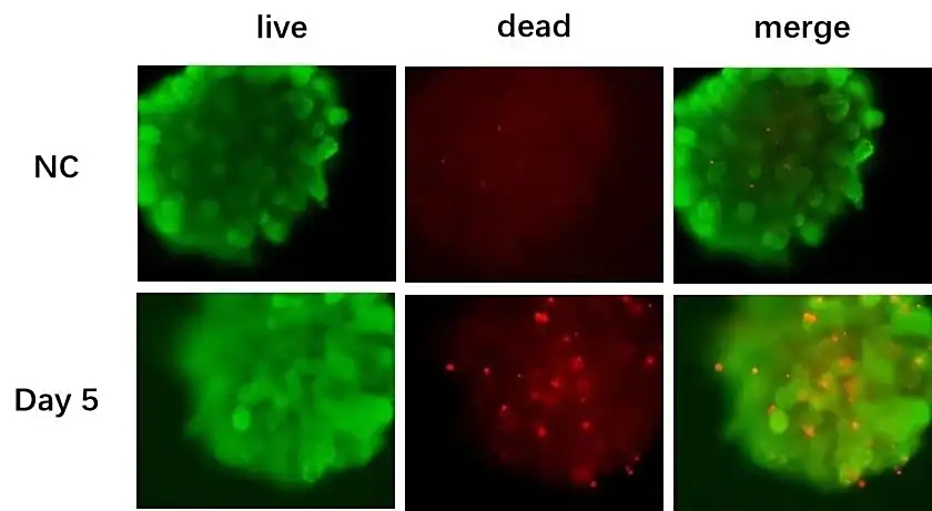 使用肝毒性阳性药物曲格列酮(Troglitazone)处理肝脏类器官,并通过AO/PI(吖啶橙/碘化丙啶)双染法检测细胞活力。结果显示,处理组中红色荧光信号(指示死细胞)显著增强,细胞死亡率显著升高。这表明,肝脏类器官可有效模拟药物对肝细胞的直接损伤作用,具备可靠的药物肝毒性评估能力。
